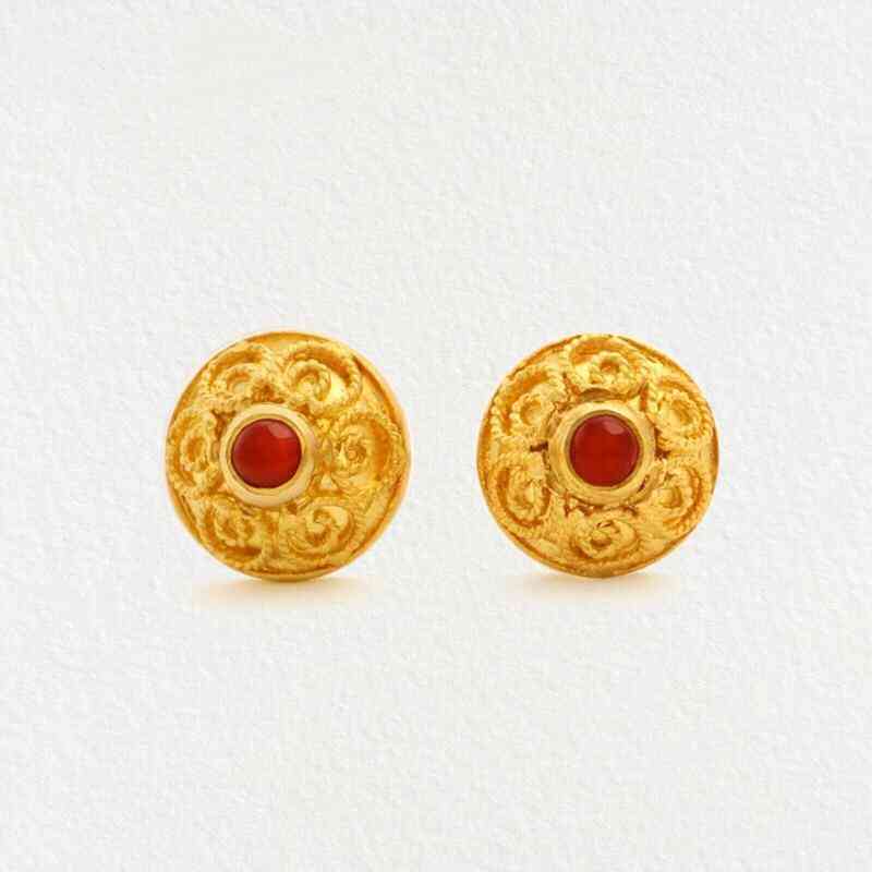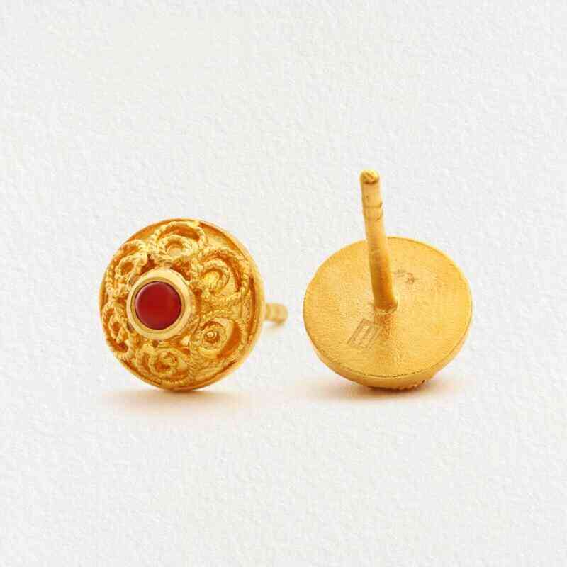 這一枚如意紋耳釘來自老鋪黃金,取圓形為外輪廓,圓形是經(jīng)典圓滿的形狀 ,金面部分鏨刻如意云紋裝飾,如意云紋以古法花絲編織的"渦紋"組成,中間包鑲紅珊瑚。寓意圓滿吉祥,鴻運(yùn)富貴。耳釘面直徑8.5MM 2克拉多的鉆石大小一對重約4克。不夸張 低調(diào)的華麗。