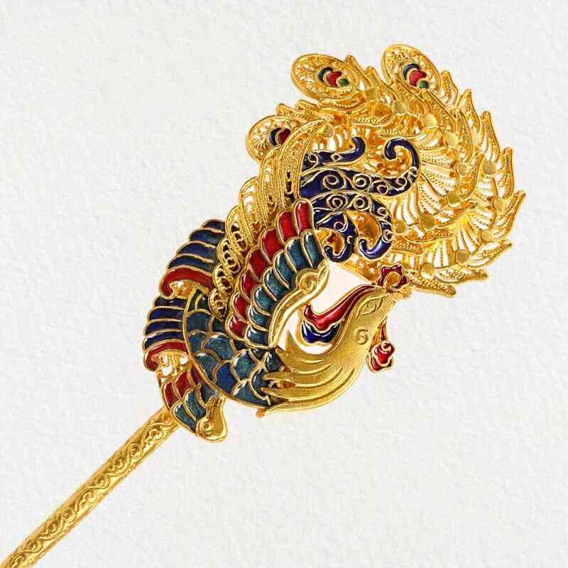 鳳是百鳥之王,是傳說中能給人們帶來幸福、光明的瑞鳥。鳳凰來儀,是祥瑞之兆?;始沂止せńz,將鳳凰靈動的神態(tài)展顯無遺;簪柄浮雕纏枝紋,寓意福氣延綿不斷。鳳羽栩栩如生,燒藍(lán)光彩奪目。雕刻精致細(xì)膩,是一件值得傳世典藏的精品。
