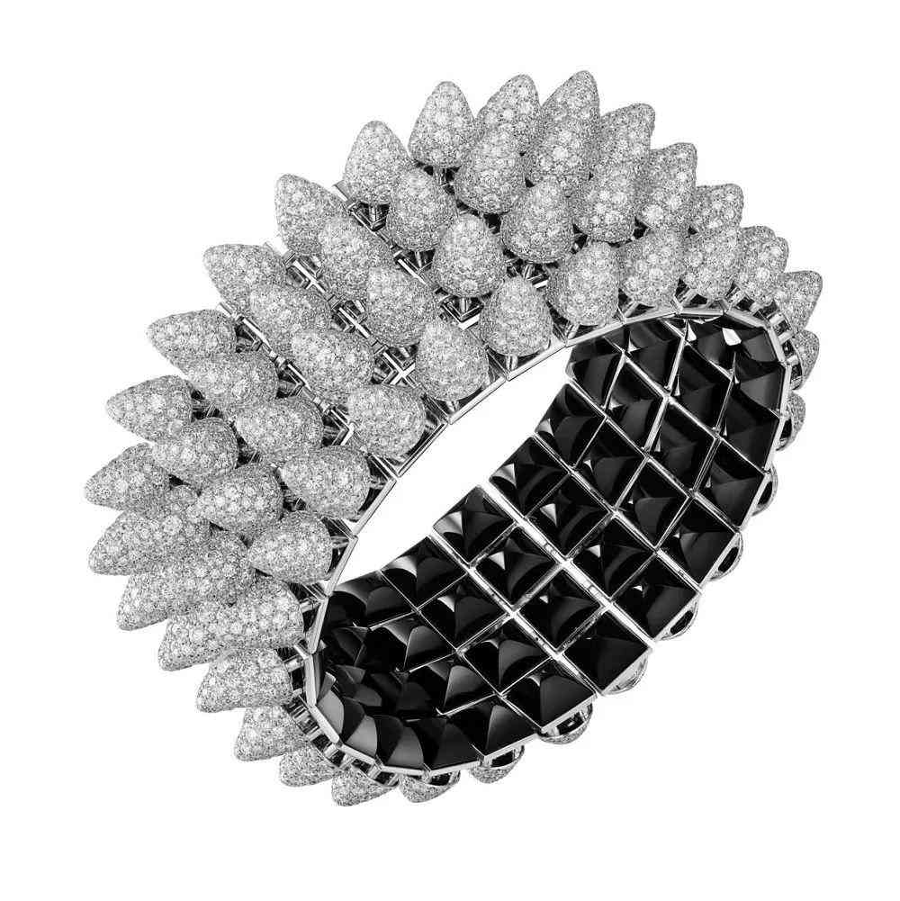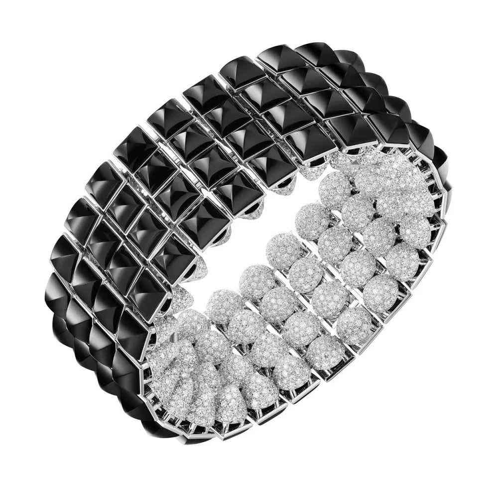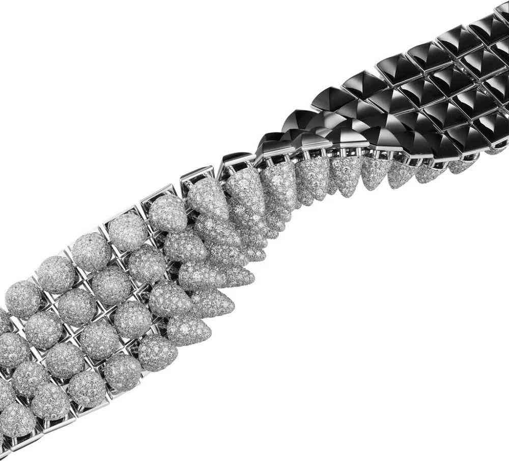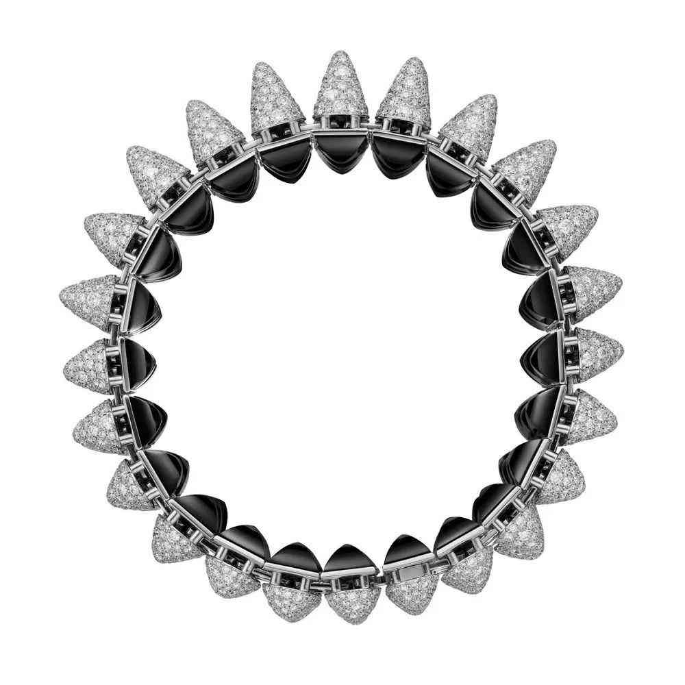 2021 年的 Clash [Un] limited 系列非???,有很多雙面結(jié)構(gòu)設(shè)計(jì)的珠寶,能翻轉(zhuǎn)變幻 2 種佩戴方式——例如 Clash [Un] limited 手鏈正面搭配鉆石鋪陳的圓形鉚釘,火彩熠熠閃光,背面則鑲嵌近 100 顆縞瑪瑙打造的方形鉚釘,深邃的黑色自然延展,讓人領(lǐng)略到朋克精神的極致對(duì)撞。