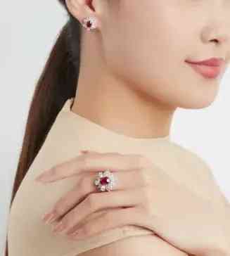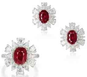 這是一套總重量 5.16 克拉的天然緬甸鴿血紅紅寶石配鉆石戒指及耳環(huán)套裝,鑒定耳環(huán)主石為兩顆天然紅寶石,紅寶石重量為 1.09 克拉、1.06 克拉,鴿血紅色,產(chǎn)地緬甸,有熱處理;鑒定戒指主石為一顆天然紅寶石,3.01 克拉,鴿血紅色,產(chǎn)地緬甸,抹谷礦,有熱處理。