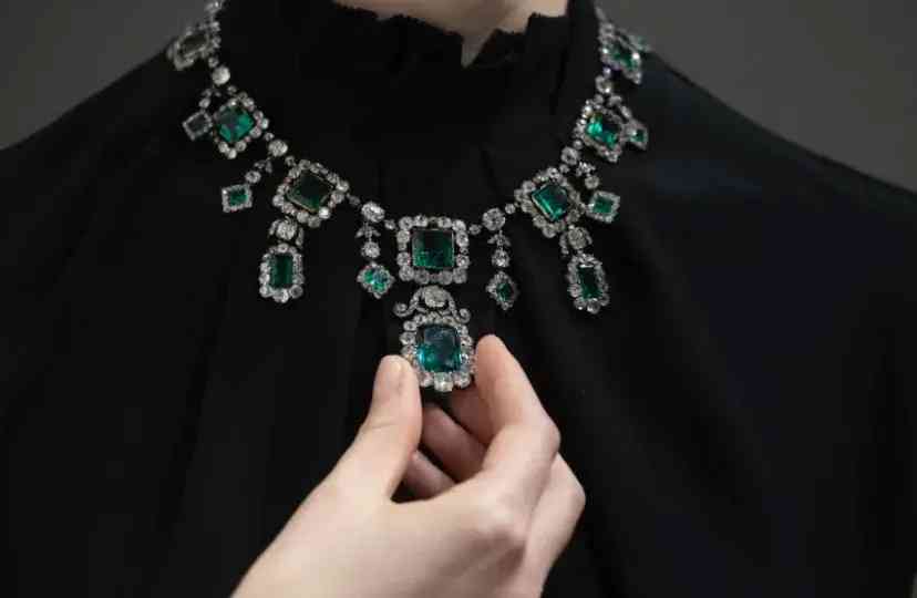 工作人員展示一串 19 世紀的祖母綠、鉆石項鏈