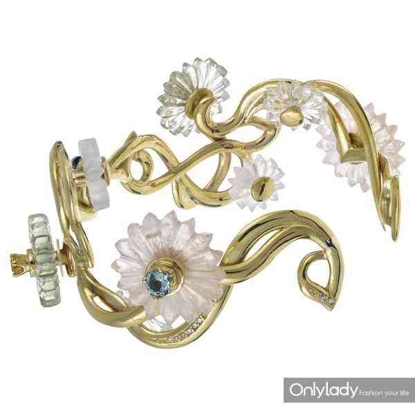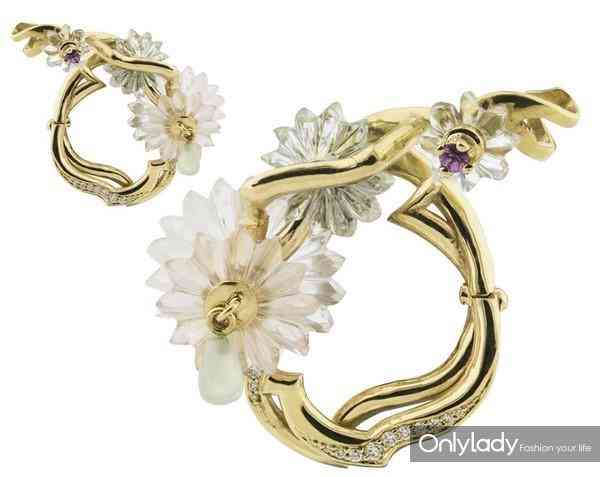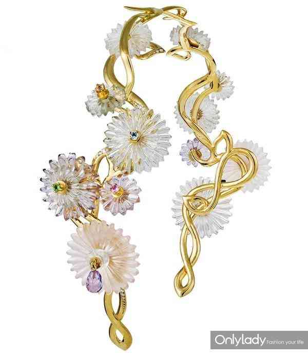 完整的Summer Snow系列由頭飾、手鐲、戒指、胸針、耳環(huán)組成,設(shè)計師為每一朵菊花都作了特別的色彩搭配,例如以紫晶、綠水晶疊合而成的花瓣搭配綠色碧璽花蕊,或是在花芯部分鑲嵌水滴形玉髓,搭配粉晶花瓣。