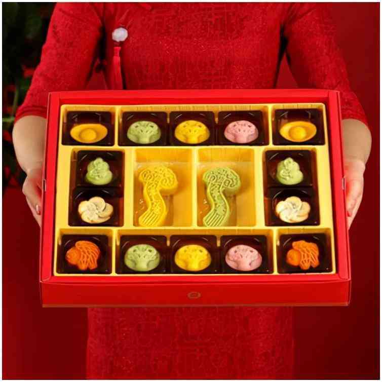 金黃色祥云禮盒,燙金工藝,瑞龍如騰空而起之形,將捆繩綁成特有的龍須之形,更增添幾分威嚴(yán)感。禮盒分三層,含北五仁、南五仁、蛋黃蓮蓉、奶黃及棗泥味的月餅,綜合南北口味,精致選材及包裝。