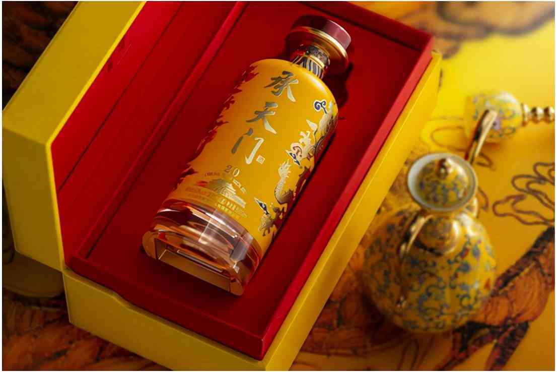 燙金浮雕承天門圖騰,彰顯氣度。瓶蓋采用仿南紅瑪瑙材質(zhì)打造,有如朝冠。瓶頸紋樣源自“海水江崖紋”,寓意福山壽海。