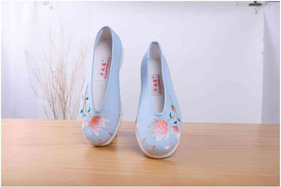 鞋面是布面手工繡荷花,內(nèi)里布面,鞋底是純棉布、棉麻制繩納底,前后貼一層防滑膠片。手工縫制,透氣、舒適,適合游園、古裝、漢服、休閑、居家、婚禮、宴會。