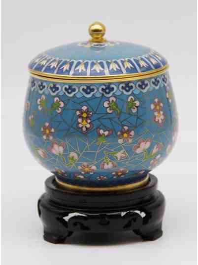 作品以梅花紋和冰裂紋巧妙結(jié)合,梅花有吐芳于歲末,凌雪展枝盛開的高潔品質(zhì),冰裂紋自然天成、錯落有致、是高雅文化的集中體現(xiàn),用景泰藍(lán)技藝的表現(xiàn)形式呈現(xiàn)出新的審美形式,體現(xiàn)出人們對大自然的崇尚,彰顯美好時代風(fēng)尚。