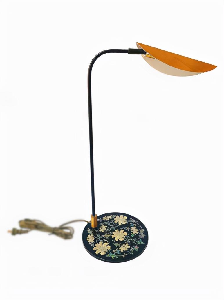 該作品底座采用金漆鑲嵌的平磨螺鈿工藝制作完成。臺燈的現(xiàn)代感與螺鈿的彩色光澤互相襯托、相得益彰。平磨螺鈿技法材料名貴、色澤艷麗多彩。從誕生之日起就備受帝王公卿所青睞,堪稱工藝珍寶。