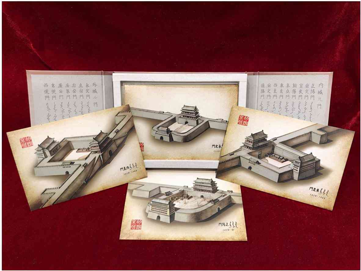 本套明信片以北京城門城墻為設(shè)計元素,在參考了上千張城門舊照及喜仁龍《北京城門城墻》一書上的數(shù)據(jù)信息后,用素描的方式將北京內(nèi)城九門、外城七門及八座角樓、兩座碉樓按照同一角度完整復(fù)原繪制出來。