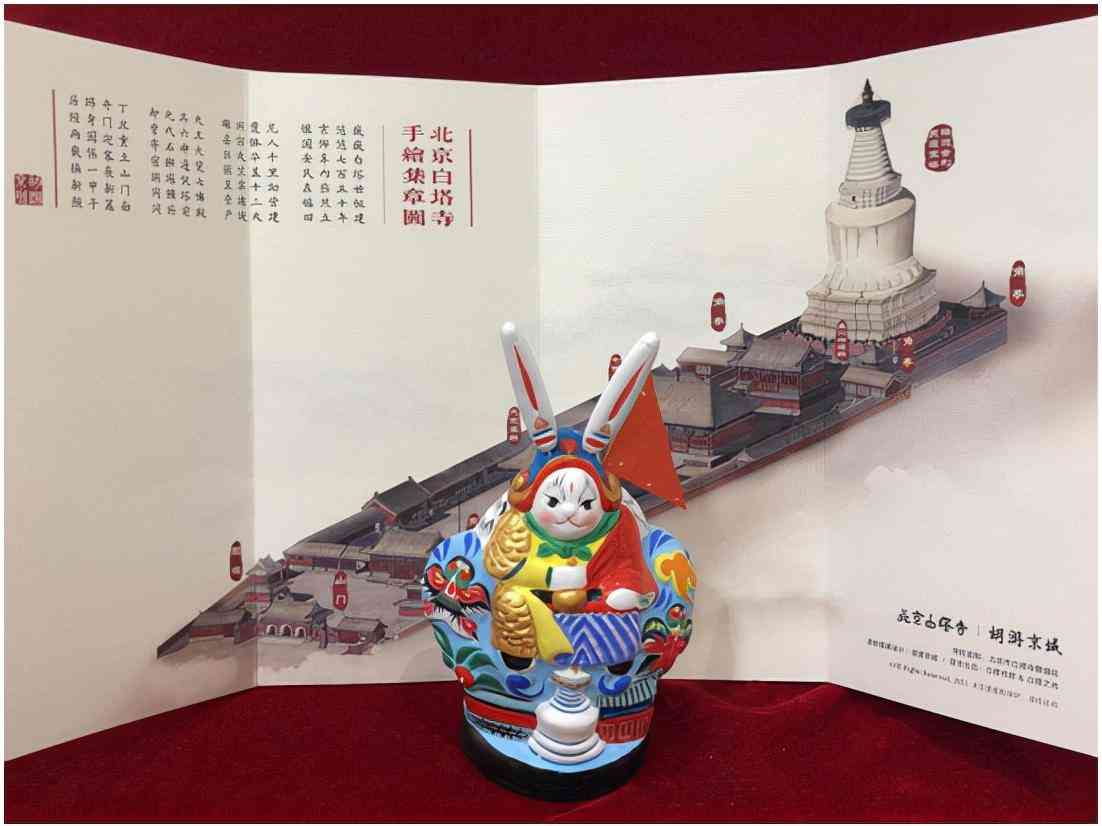 此兔兒爺嚴(yán)格按照民間傳統(tǒng)泥彩塑工藝制作,以傳統(tǒng)“山子”兔兒爺形象為基礎(chǔ),身披紅袍金甲,背插單挑令旗,身下正中為妙應(yīng)白塔,左右兩側(cè)為白塔寺標(biāo)志性的紅墻大殿,上方兩側(cè)為北京傳統(tǒng)沙燕風(fēng)箏造型。