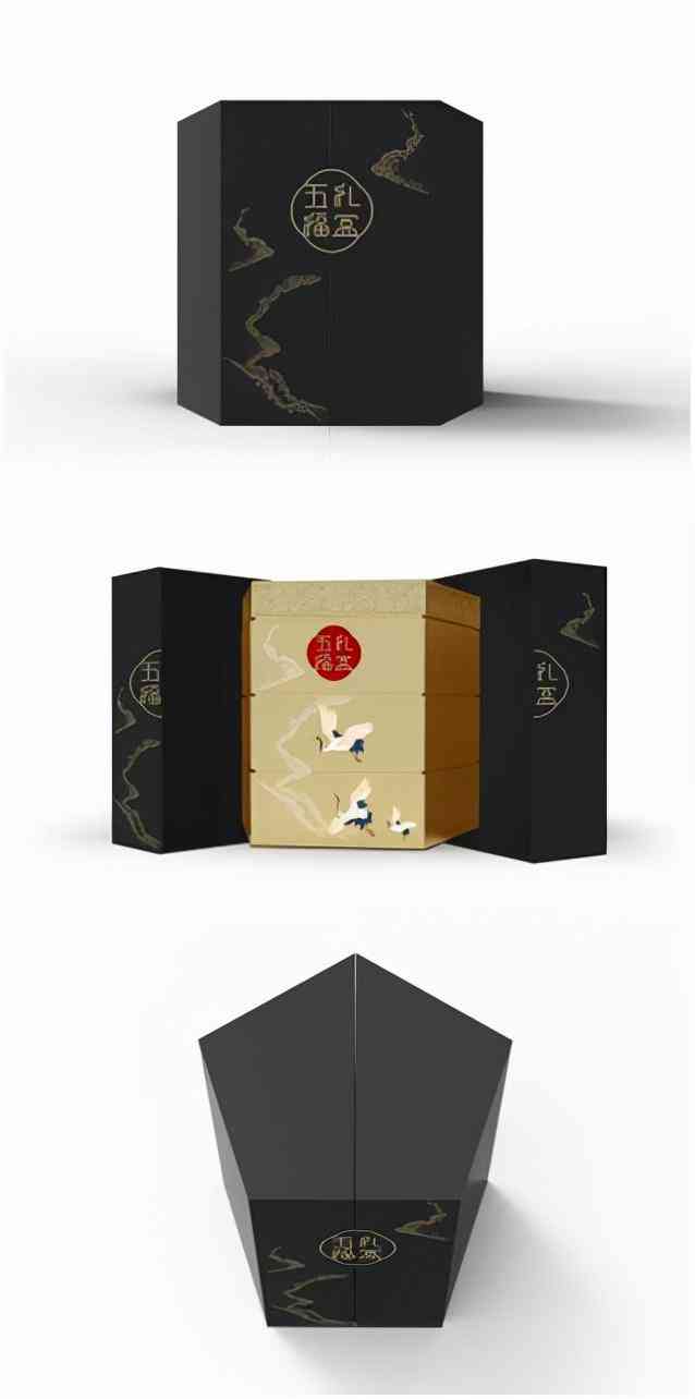 “五福禮盒”以三層五邊形打造,整個設(shè)計靈感來源中國古代食盒設(shè)計,包裝打開里邊呈現(xiàn)出三層內(nèi)盒,內(nèi)裝有5種杜仲產(chǎn)品。燙金工藝使得中國傳統(tǒng)吉祥紋樣鶴和云栩栩如生。