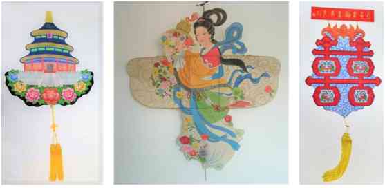 風(fēng)箏,歷史悠久文化,底蘊(yùn)深厚。三件作品分別為“百年華誕喜事多”為建黨百年而作,名勝古跡“天壇”和民間故事“天女散花”;他們運(yùn)用風(fēng)箏工藝,集南北軋制的精華于一體,以選、扎、糊、繪、放的制作工藝制作而成。