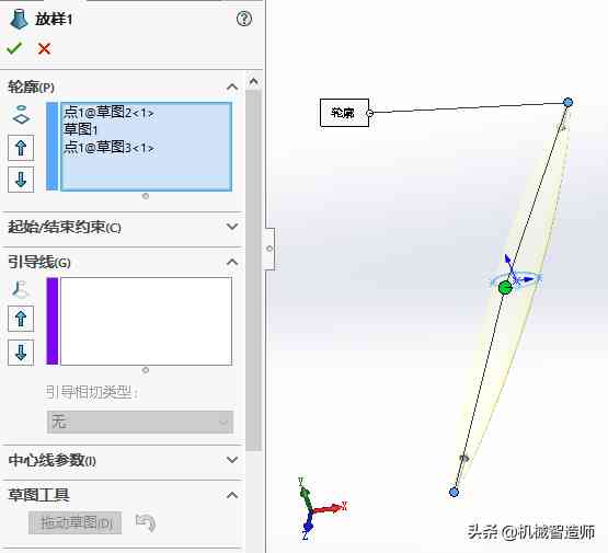 2、放樣曲面,在新建的兩個基準(zhǔn)面上分別草繪一個點,在前視基準(zhǔn)面上繪制一個橢圓,橢圓中心和兩個草繪點在一個水平線上。