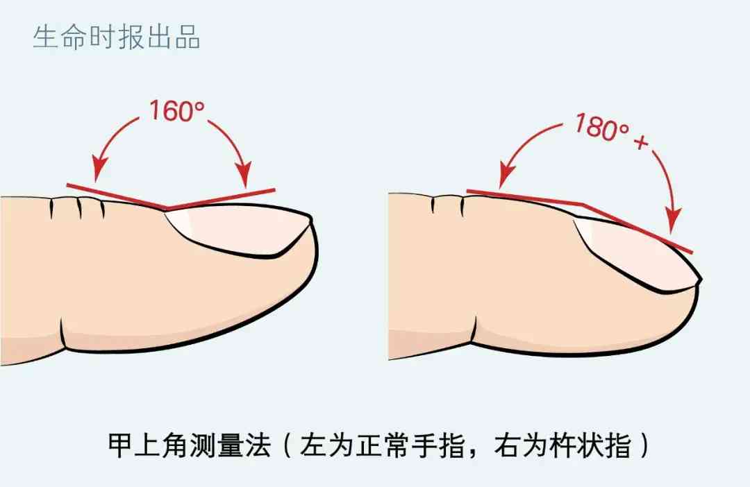 甲上角是指手指末節(jié)背面皮膚與指甲構(gòu)成的基底角,正常人的角度小于160°,但早期杵狀指甲上角往往大于180°。