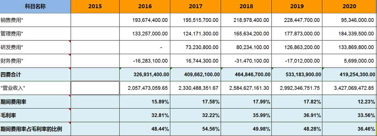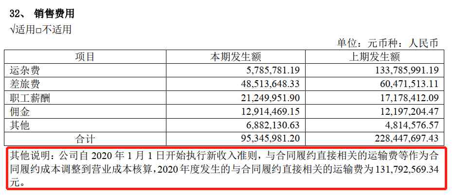 期間費(fèi)用率占毛利率的比例大于40%,成本控制能力差。2020年突然降低主要是銷售費(fèi)用減少所致,執(zhí)行新收入準(zhǔn)則,與合同履約直接相關(guān)的運(yùn)輸費(fèi)等作為合同履約成本調(diào)整到營業(yè)成本核算,2020年度發(fā)生的與合同履約直接相關(guān)的運(yùn)輸費(fèi)為131,792,569.34元。
