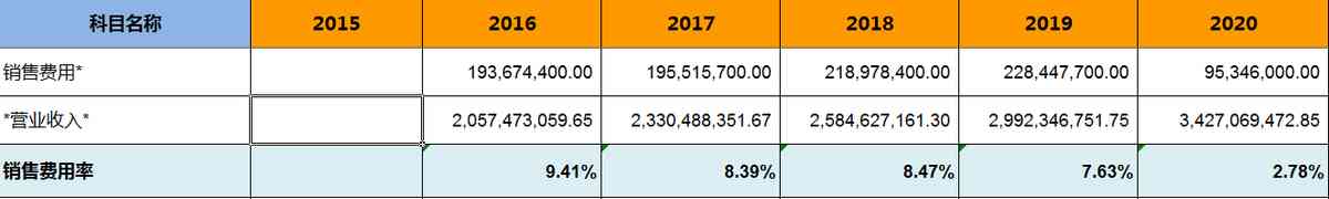 銷售費(fèi)用率小于15%,其產(chǎn)品比較容易銷售,銷售風(fēng)險(xiǎn)相對較小。