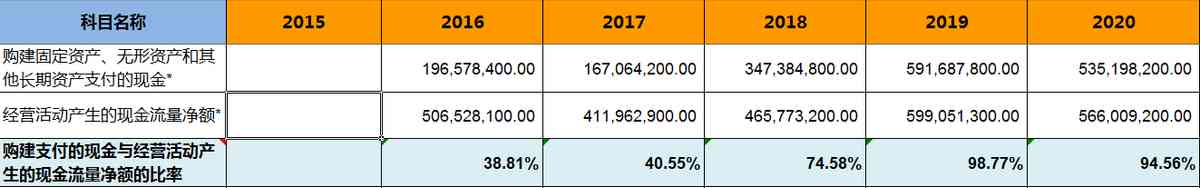 購建支付的現(xiàn)金與經(jīng)營活動產(chǎn)生的現(xiàn)金流量凈額的比率較大,說明一直在快速擴(kuò)張,增長潛力較大。
