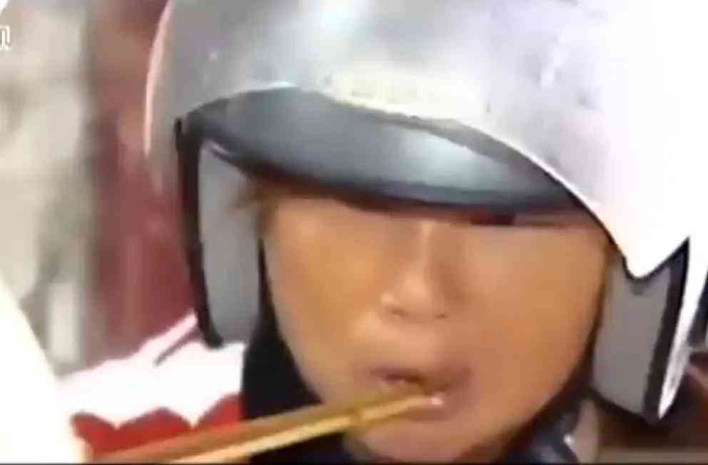 這不,這天中午孫俊文在家宴客,主與客共6人,個(gè)個(gè)不顧炎熱戴著頭盔吃飯,看起來既奇怪,又好笑。