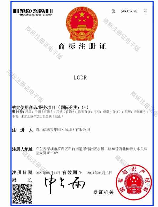 周小福云珠寶正是瞄準了這一商機,果斷申請了LGDR字樣14類商標,并于日前正式拿到了注冊證書。
