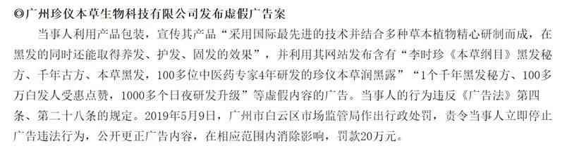 【案例】珍儀本草:虛假內(nèi)容廣告被罰 2019年,廣州珍儀本草生物科技有限公司發(fā)布含有“千年古方”、“黑發(fā)秘方”“讓你一生擁有永久黑頭發(fā)”等內(nèi)容的虛假內(nèi)容廣告,被罰款20萬(wàn)元。