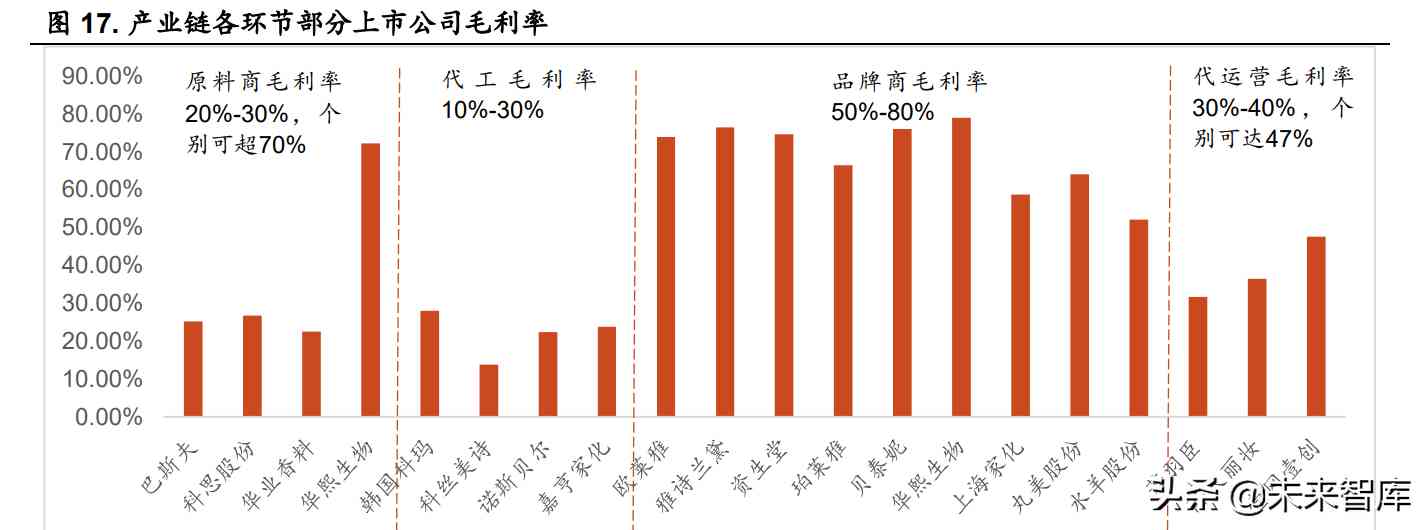 我們從各環(huán)節(jié)選取一些具有代表性的上市公司,來探究各環(huán)節(jié)的盈利能 力。毛利率方面,上游原料商的毛利率水平一般為 20%-30%,美妝代工廠的 毛利率為 10%-30%。個別原料提供商如透明質(zhì)酸龍頭華熙生物的原料產(chǎn)品 業(yè)務(wù)毛利率可達 70%。中游品牌商的毛利率最高,區(qū)間在 50%-80%。其中, 國際大牌和國產(chǎn)功能性護膚品牌毛利率在 70%-80%,傳統(tǒng)國貨品牌的毛利 率大多在 60%-70%,水羊股份毛利率在 50%左右,主要由于其貼片面膜品 類毛利率較低,新銳品牌尚處于培育期,且增加了品牌代理業(yè)務(wù)。下游代運 營商的毛利率為 30%-40%,個別企業(yè)如壹網(wǎng)壹創(chuàng)毛利率可達 47%,主要由 于其業(yè)務(wù)結(jié)構(gòu)中高毛利率的品牌線上管理服務(wù)(服務(wù)費模式,不買斷產(chǎn)品)占比較高,低毛利率的買斷模式(經(jīng)銷模式)占比較低。另外,根據(jù)艾瑞咨 詢的信息,下游經(jīng)銷商的毛利率為 20%-40%,零售終端的毛利率為 30%-40%。