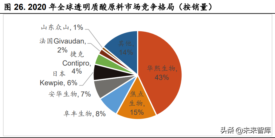從競爭格局看,行業(yè)集中度較高,華熙生物穩(wěn)居龍頭地位。2020 年,全 球銷量排名前五的透明質(zhì)酸原料企業(yè)均為國內(nèi)企業(yè),華熙生物、焦點生物、 阜豐生物、安華生物銷量占比分別為 43%/15%/8%/7%,合計占比 73%。國 內(nèi)頭部企業(yè)擁有領(lǐng)先的技術(shù)優(yōu)勢和規(guī)模化帶來的成本優(yōu)勢,出口價格低于境 外公司同等產(chǎn)品,行業(yè)格局較為穩(wěn)定。