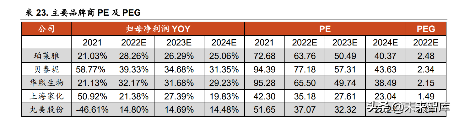 PEG 角度:品牌商 PEG 的區(qū)間范圍為 1.5-2.5X。組織架構(gòu)高效,盈利 能力穩(wěn)定的公司通常 PEG 水平較高,比如珀萊雅。部分景氣細分賽道擁有 較明顯的研發(fā)壁壘或背書壁壘,代工普及化和營銷多元化背景下,競爭格局 優(yōu)于的傳統(tǒng)化妝品賽道,存在估值溢價,通常 PEG 水平較高。比如貝泰妮所 處的敏感肌護膚賽道增速高,且顧客復(fù)購率高,皮膚科醫(yī)生背書打造薇諾娜 品牌獨特的競爭壁壘;華熙生物擁有玻尿酸研發(fā)壁壘,主打“玻尿酸+”護膚 概念,“成分黨”崛起使其功能性護膚品業(yè)務(wù)發(fā)展壯大。上海家化除經(jīng)營美容 護膚產(chǎn)品外,個護和母嬰產(chǎn)品營收占比也較高,PEG 水平低于化妝品業(yè)務(wù)營 收占比較高的公司。丸美股份過去 2 年歸母凈利潤均同比下滑,PEG 水平不 具備參考價值,PE 估值水平未超過 40-60X 估值上限。