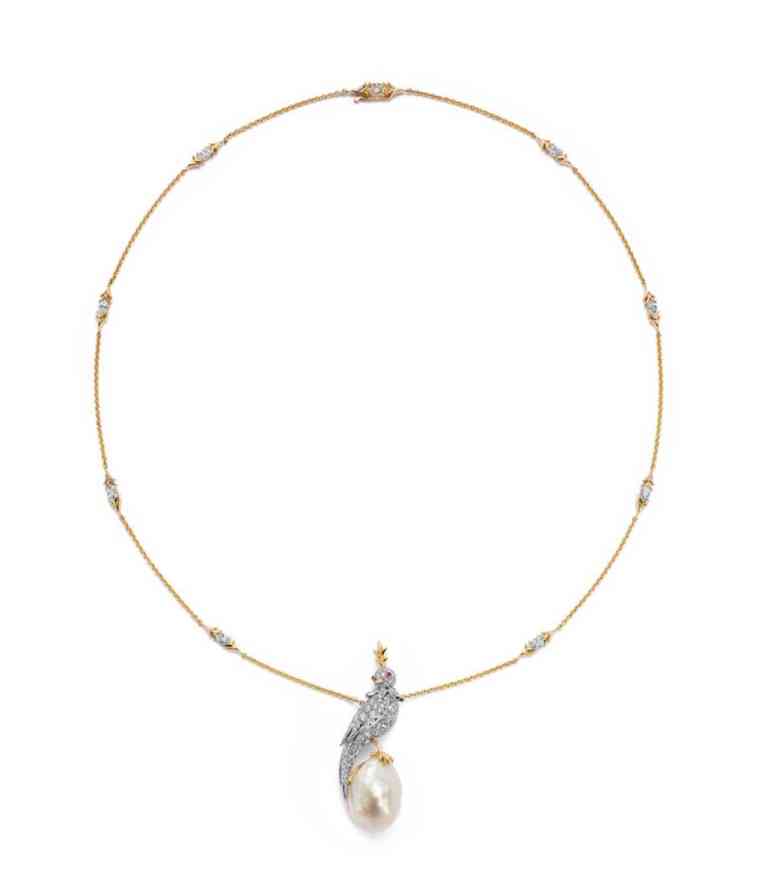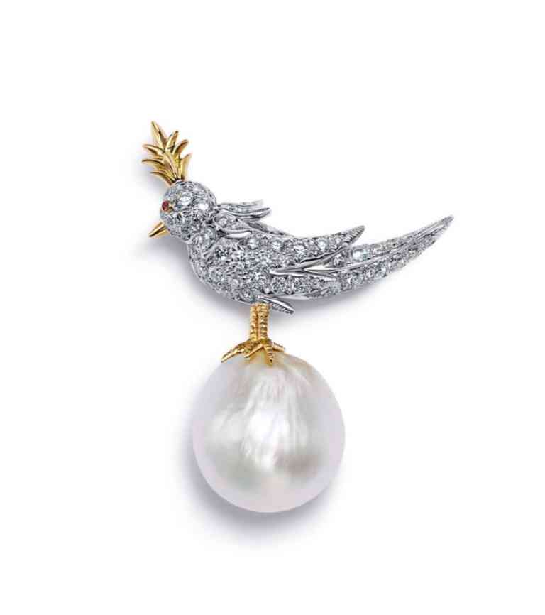 Tiffany & Co. 蒂芙尼Schlumberger?高級珠寶系列鉑金及18K黃金鑲嵌一顆重逾30克拉的白色巴洛克天然海水珍珠,鉆石及粉色藍寶石Bird on a Pearl吊墜