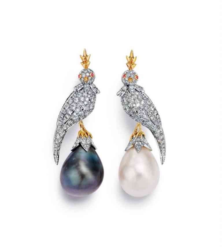Tiffany & Co. 蒂芙尼Schlumberger?高級珠寶系列鉑金及18K黃金鑲嵌一顆重逾14克拉的白色水滴形天然海水珍珠,一顆重逾17克拉的深灰色水滴形天然海水珍珠,鉆石及粉色藍寶石Bird on a Pearl耳環(huán)