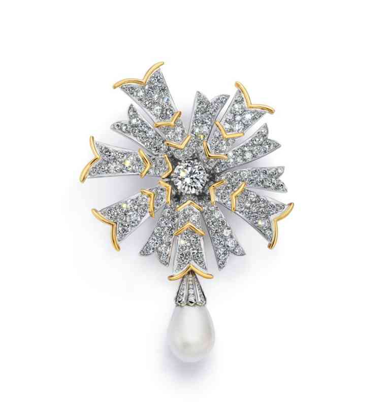 Tiffany & Co. 蒂芙尼Schlumberger?高級珠寶系列鉑金及18K黃金鑲嵌一顆重逾16克拉的奶油色水滴形天然海水珍珠及鉆石緞帶造型胸針
