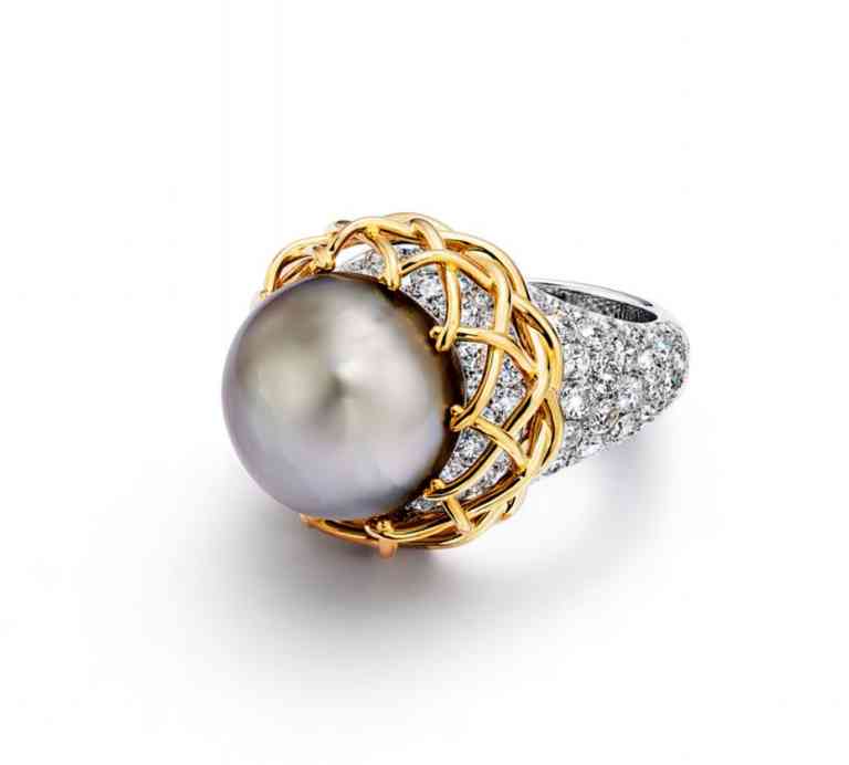 Tiffany & Co. 蒂芙尼Schlumberger?高級珠寶系列鉑金及18K黃金鑲嵌一顆重逾15克拉的灰色紐扣形天然海水珍珠及鉆石Pavé Wire Wrap戒指
