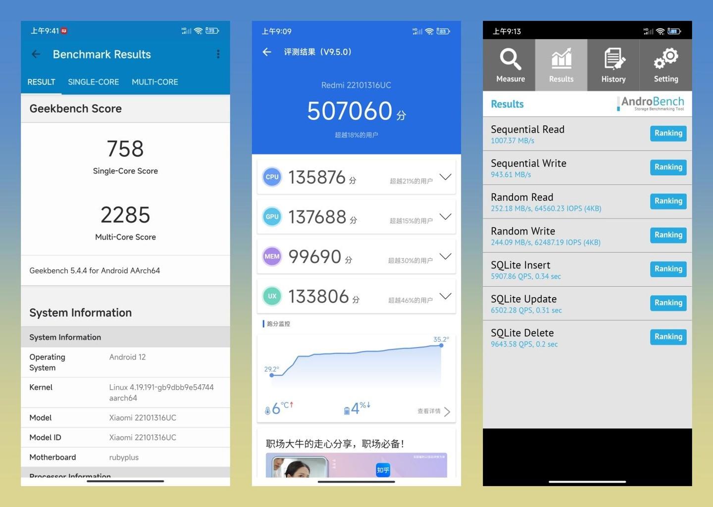 在測試中,我們開啟了 Redmi Note 12 探索版的高性能模式,通過安兔兔、Geekbench5 以及 Androbench 進(jìn)行測試: