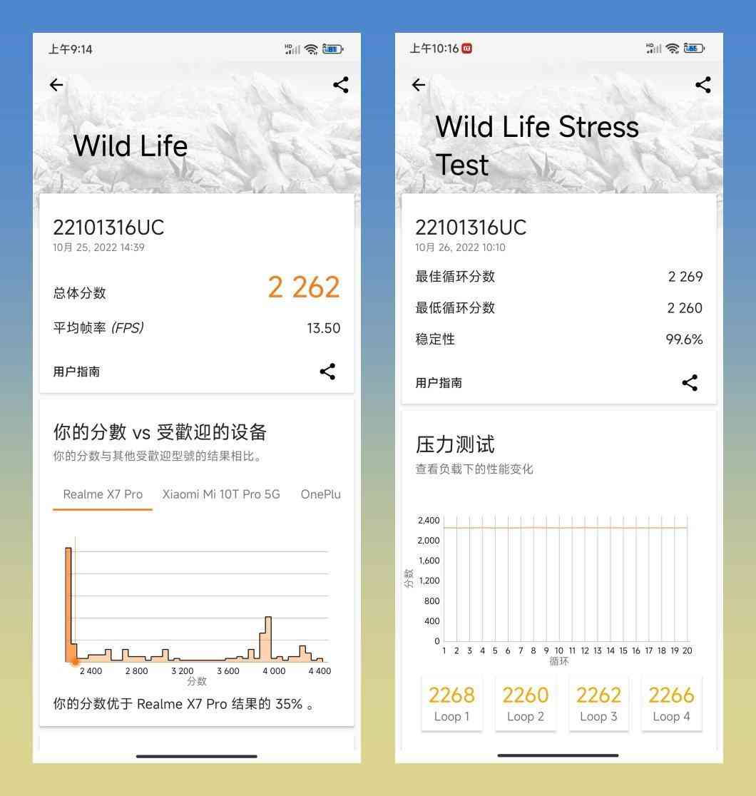 在 3DMark 中的 Wild Life Stress Test 項(xiàng)目中,Redmi Note 12 探索版獲得了高達(dá) 99.6% 的穩(wěn)定性,從測試圖來看,Redmi Note 12 探索版在 20 輪的測試中表現(xiàn)始終保持穩(wěn)定狀態(tài),這也代表著性能釋放比較穩(wěn)定。此外,在 Wild Life 測試中,Redmi Note 12 探索版獲得了 2262 的整體分?jǐn)?shù),幀率為 13.50。