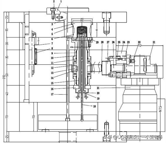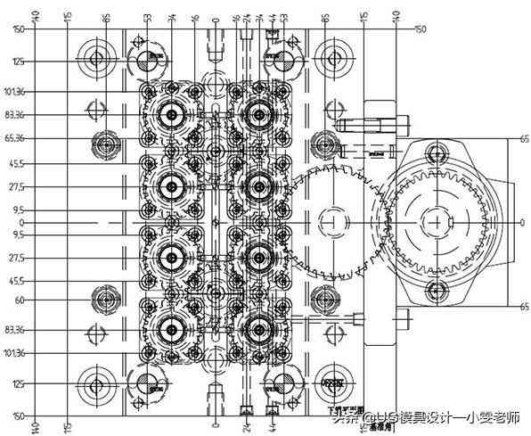 化妝品包材類的多腔模具由于結(jié)構(gòu)特殊,往往需要采用非標模胚。模具設(shè)計時,盡可能在標準模胚的基礎(chǔ)上,通過增加模板等方式完成模具功能。非標模胚為2330,動模增加兩層模板,用來設(shè)計和安放齒輪機構(gòu)。塑件的澆口為牛角澆口,這是潛伏式澆口的一種變型。澆口位置在瓶蓋的邊緣底部。牛角澆口的優(yōu)點是澆口痕跡較小,不影響塑件外觀,頂出時可以自動切斷,實現(xiàn)塑件和流道凝料的自動分離,便于全自動注塑。