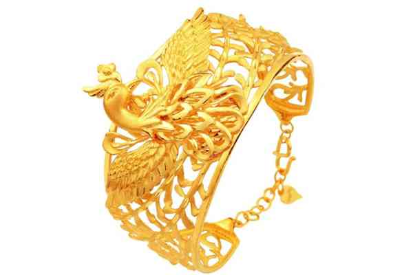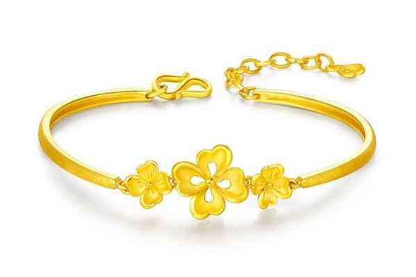 金手鐲雖然不屬于傳統(tǒng)“三金”物品,但很多新人還事將其作為必備的婚嫁黃金首飾。如今金手鐲的款式造型較多,有玫瑰、蓮花、牡丹、龍鳳、祥云等圖案,搭扣、鏤空、實(shí)心等種類,并且寬度有粗有細(xì),新人選擇也更多了。建議大家選擇一些小巧精致的金手鐲佩戴,如果金手鐲太粗,搭配就會(huì)比較違和。推薦大家選擇如下圖的這款周大福金手鐲,既小巧,又有獨(dú)特的寓意,千足金光沙打磨也讓手鐲看上去特別有質(zhì)感。