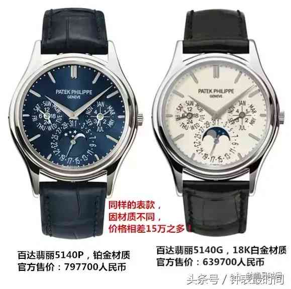 上邊我們已經(jīng)提到,同樣的一款表,鉑金表要比18K白金表貴出許多;就拿百達翡麗的5140來說,18K白金版官方售價為639700人民幣,而鉑金版的則高達797700人民幣,兩款相差15萬多人民幣!所以,我們再也不能混淆兩種材質(zhì)了。