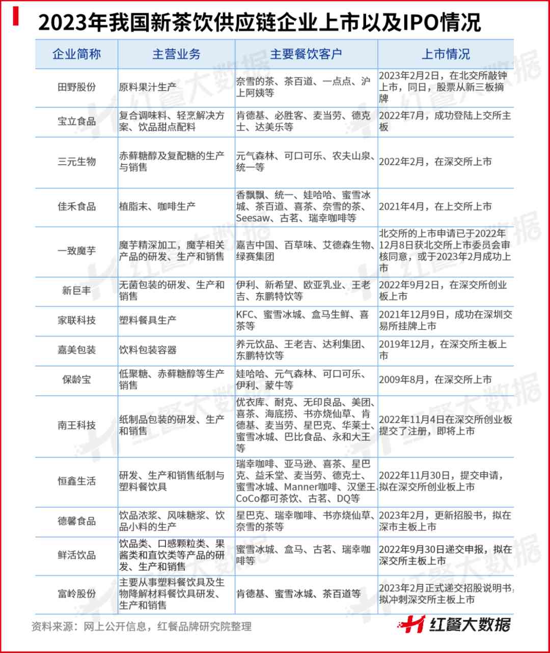 值得一提的是,2023年年初,一份“IPO紅綠燈”行業(yè)審核標(biāo)準(zhǔn)的細(xì)則在網(wǎng)上流傳開(kāi)來(lái)。一些業(yè)內(nèi)人士表示,若其內(nèi)容屬實(shí),除了對(duì)茶飲連鎖企業(yè)的上市進(jìn)程或會(huì)造成一些影響之外,恐怕也會(huì)或多或少影響新茶飲供應(yīng)鏈企業(yè)。