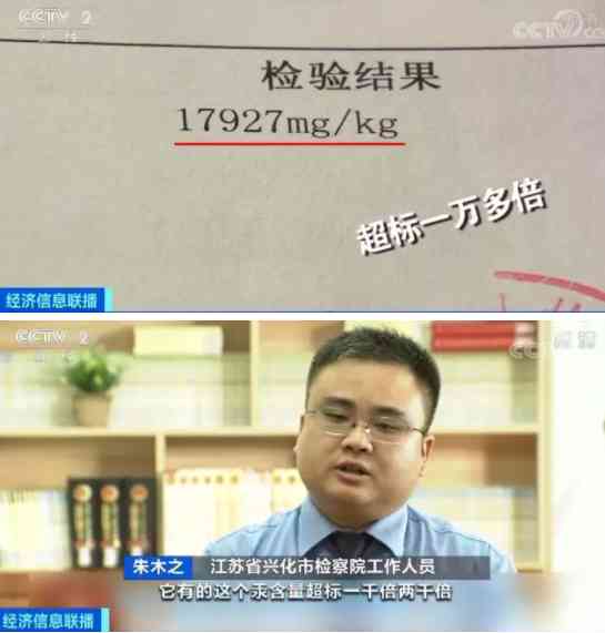 江蘇省興化市檢察院工作人員 朱木之:從我們檢測的結(jié)果來看,它有的這個(gè)汞含量超標(biāo)一千倍兩千倍,有的甚至超標(biāo)上萬倍。