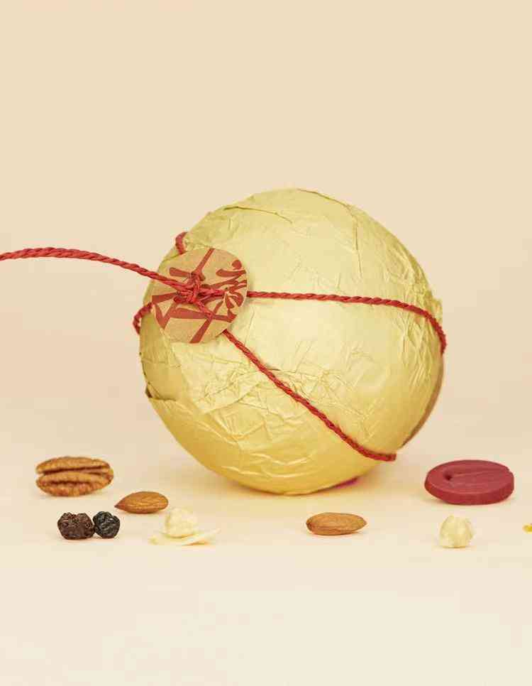 「碎碎平安」:純脂黑巧做的巨大巧克力球包入10種年貨果子?;⒑鸫豪椎姆饷嬖O(shè)計讓限制鞭炮的城市人獲得一絲額外的欣慰。
