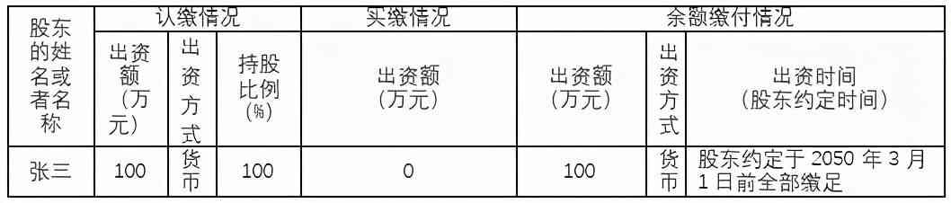 如章程約定下圖:則股東張三的認繳出資額為100萬,認繳出資時間為:2050年3月1日,認繳出資方式為:貨幣。實繳出資額為0萬元。