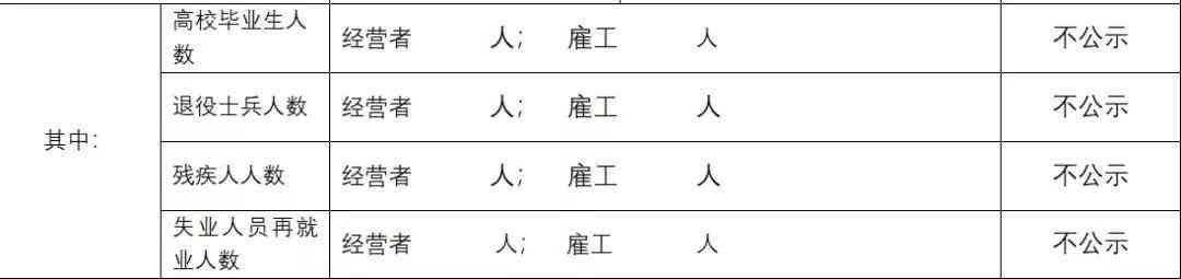 填報時還需注意:一是“高校畢業(yè)生人數(shù)”是指報告期內(nèi)錄用的畢業(yè)兩年內(nèi)的高校畢業(yè)生;二是“退役士兵人數(shù)、殘疾人人數(shù)、失業(yè)人員再就業(yè)人數(shù)”是指報告期內(nèi)錄用的退役士兵、殘疾人數(shù)、失業(yè)人員再就業(yè)人數(shù)。此類信息為不公示信息。