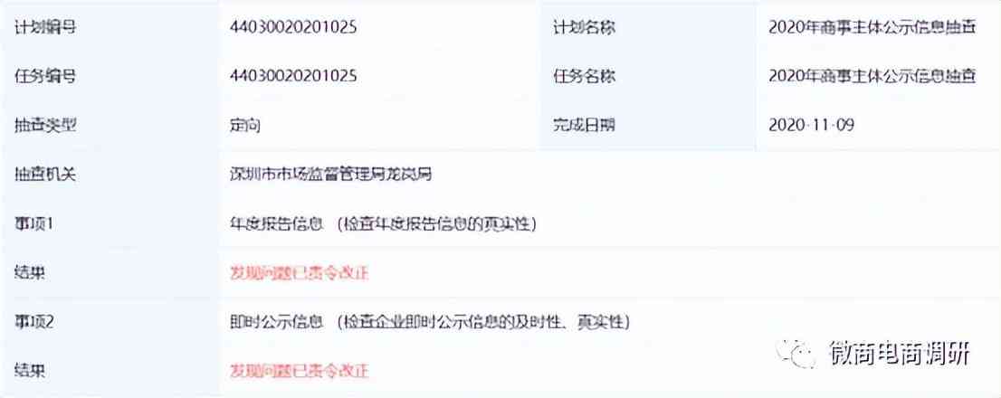 不過值得注意的是,據(jù)企查查顯示,在2020年,深圳悅嘉麗電子商務(wù)有限公司還曾在雙隨機抽查中被深圳市市場監(jiān)督管理局龍崗局發(fā)現(xiàn)存在問題。