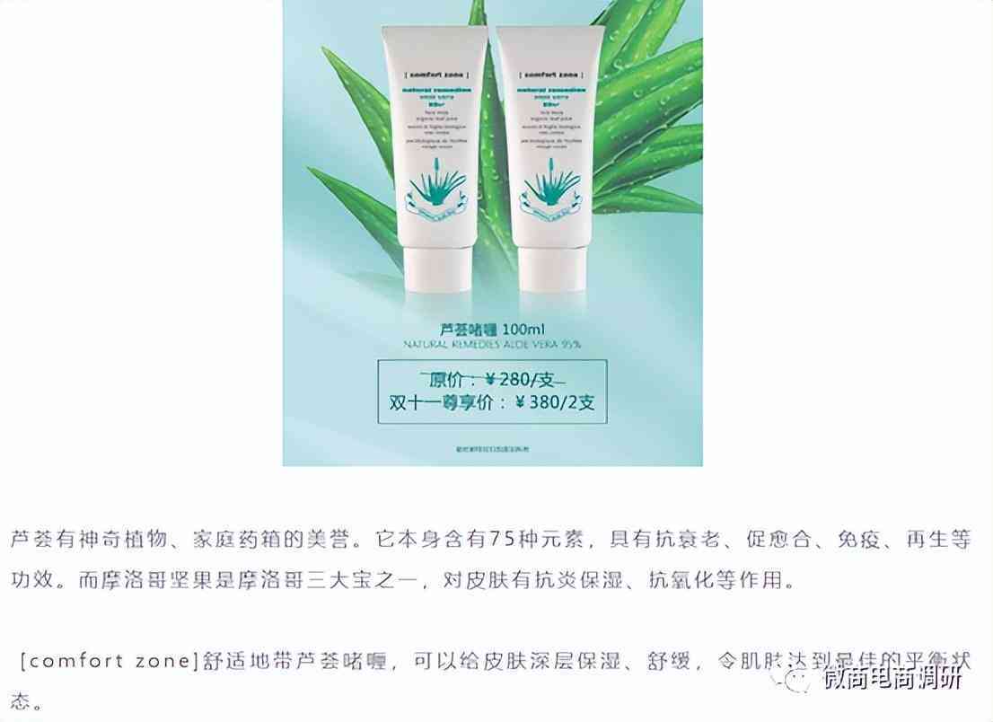 截至目前,悅嘉麗已面向市場推出了多款產(chǎn)品,“comfort zone蘆薈啫喱(舒適地帶蘆薈啫喱)”便是其中之一,官方公眾號“YOKELLY悅嘉麗”曾在題為《救急︱曬后黃金72小時,該怎么補救?》的文章中指出這款產(chǎn)品具有消炎功效:“曬過太陽后,肌膚正處于皮脂膜受損的狀態(tài),首先要做的就是要厚敷一層蘆薈啫喱,消炎鎮(zhèn)定、舒緩肌膚曬后的緊張狀態(tài)”,并附有相關(guān)產(chǎn)品包裝圖片與功效宣稱用語。