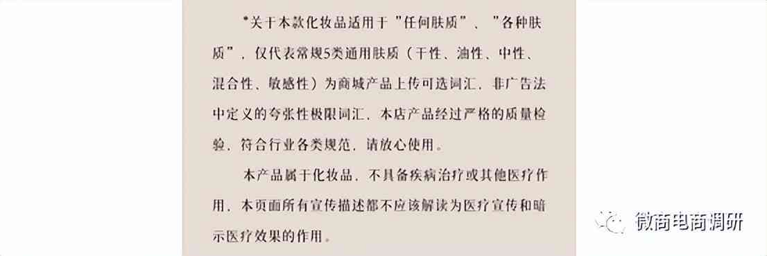 但據(jù)科妝網(wǎng)顯示,該產(chǎn)品的備案文號為“國妝備進字J20145428”,可見,該產(chǎn)品僅具有化妝品資質(zhì),并非藥品。根據(jù)《化妝品命名規(guī)定》、《化妝品命名指南》等文件要求,化妝品宣稱用語應(yīng)根據(jù)其語言環(huán)境來確定,禁止表達的詞意或使用的詞語包括但不限于以下詞語:醫(yī)療術(shù)語、明示或暗示醫(yī)療作用和效果的詞語。顯然,悅嘉麗官方公眾號所宣傳的“消炎”功效超出了化妝品定義,屬于超范圍宣傳和宣傳醫(yī)療作用,屬于違規(guī)宣傳?!痘瘖y品標簽標識管理辦法》第十五條規(guī)定,明示或暗示具有醫(yī)療作用的內(nèi)容為禁止標注的內(nèi)容,其中就包括“抗炎”、“消炎”等關(guān)鍵詞。