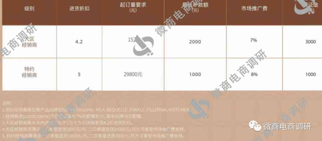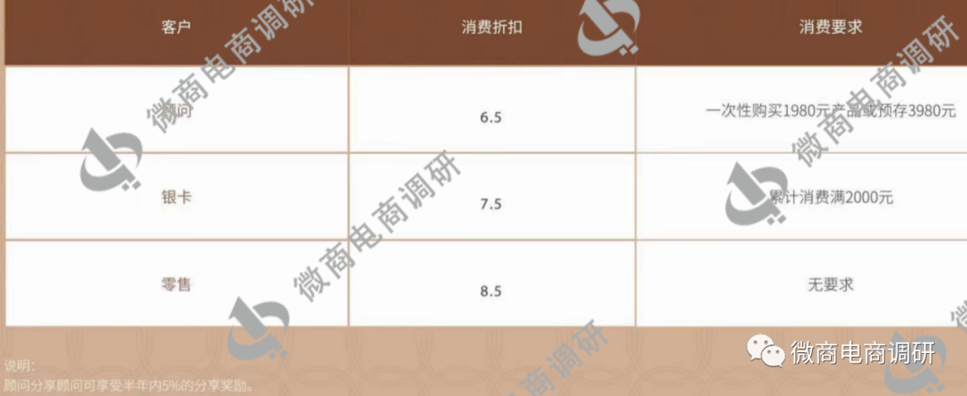 接下來,我們再來關(guān)注一下悅嘉麗推行的獎金制度該如何解讀。據(jù)推廣人員阿強(化名)提供的資料顯示,大體來看,悅嘉麗的經(jīng)銷商主要可以分為六個級別,分別是銀卡(拿貨7.5折)、顧問(拿貨6.5折)、特約經(jīng)銷商(拿貨5折)、大區(qū)經(jīng)銷商(拿貨4.2折),之后就是總經(jīng)銷商(拿貨3.7折)、聯(lián)創(chuàng)這樣的高級別代理了。