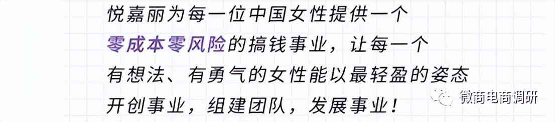 無獨有偶,早前,另外一個公眾號“悅嘉麗創(chuàng)享匯”也在宣傳文章當中涉及到了“為中國女性提供了一個低門檻、零風險、高回報的事業(yè)平臺”的描述。