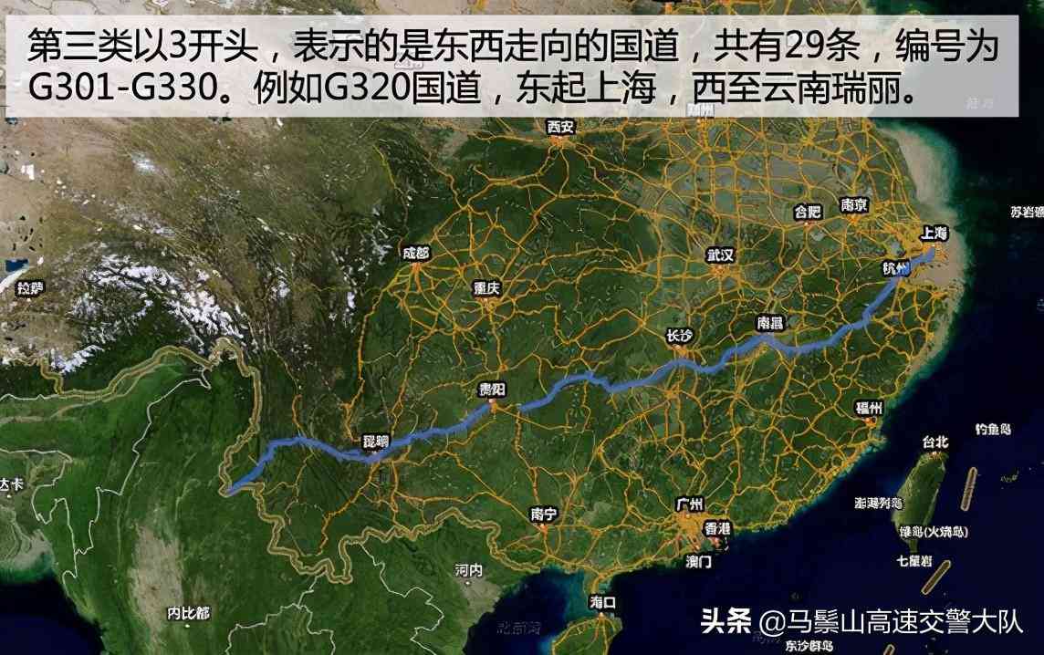 具體編號(hào)為:G301—G361(其中G313被取消),表示東西走向的國(guó)道,也包括省內(nèi)東西走向的國(guó)道,比如:G329,連接了浙江的舟山和杭州;以及省際之間東西走向的國(guó)道,比如:G320國(guó)道,東起上海,南至云南瑞麗,貫穿了東西兩邊。