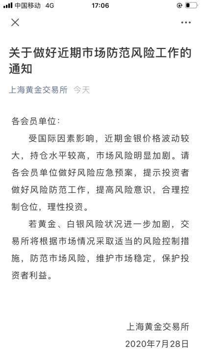 由于今日金價波動加劇,上海黃金交易所專門發(fā)布通知提示風(fēng)險,請各會員單位要提示投資者做好風(fēng)險防范工作,提高風(fēng)險意識,合理控制倉位,理性投資。