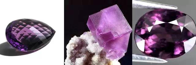 紫色寶石非常少,紫水晶是一個典型的例子,螢石也會有紫水晶一樣色色彩,有些尖晶石、碧璽和藍寶石也會有漂亮的紫色。玉髓有時候會顯示出獨特的薰衣草色。常見的紫色寶石有: