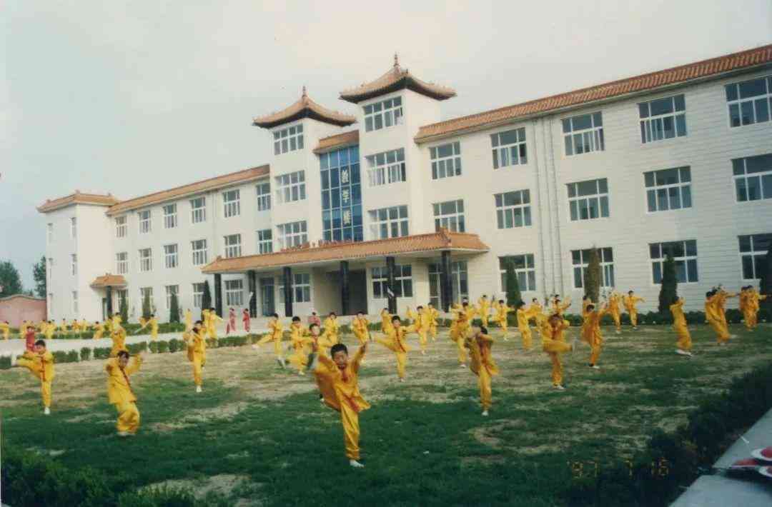 上個世紀(jì)九十年代,萊州中華武校教學(xué)樓初建時同學(xué)們在樓前訓(xùn)練。受訪者供圖