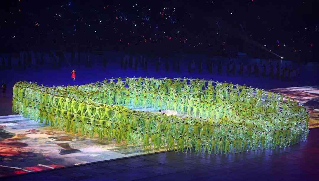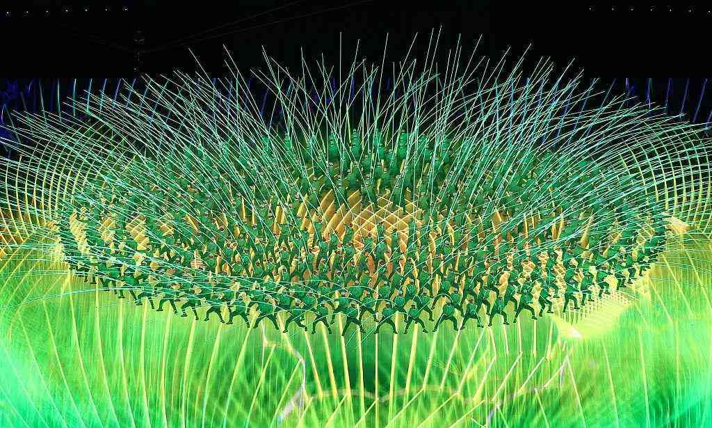 此時,鳥巢中央,一抹綠色拂動。9個同心圓聚攏而成的綠色柔性發(fā)光桿,漸次舒展,合攏,再打開。